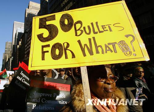 這是2006年12月16日,一名女子手舉抗議標(biāo)語(yǔ)參加在紐約第五大道舉行的抗議游行,標(biāo)語(yǔ)牌上寫(xiě)道:為什么要開(kāi)50槍?當(dāng)日,數(shù)千名美國(guó)民眾聚集在紐約第五大道舉行示威活動(dòng),抗議非洲裔美國(guó)人肖恩·貝爾上月遭警察無(wú)端射殺。在美國(guó),警察濫施暴力,侵犯公民權(quán)利。 新華社發(fā)