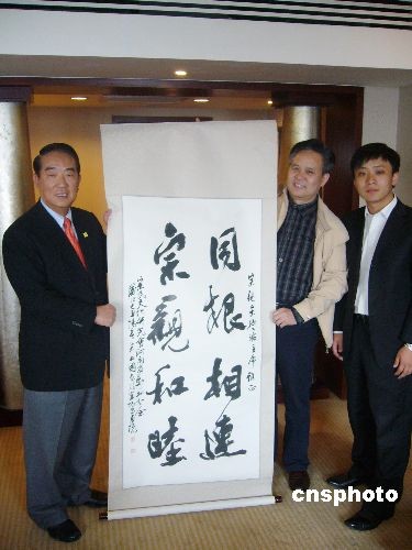 四月六日,親民黨主席宋楚瑜在河南鄭州會(huì)見著名書法家、河南省嵩陽書畫院院長(zhǎng)宋衛(wèi)國。宋衛(wèi)國向宋楚瑜贈(zèng)送《同根相連 宗親和睦》的字幅。 中新社發(fā) 王中舉 攝