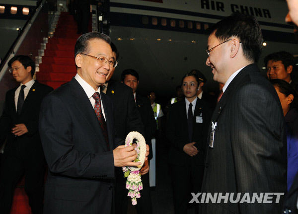 當(dāng)?shù)貢r(shí)間19時(shí)10分許,溫家寶總理乘坐專(zhuān)機(jī)抵達(dá)泰國(guó)羅勇烏塔堡海軍航空基地機(jī)場(chǎng)。