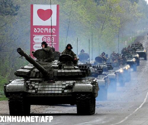 5月5日,一隊(duì)格魯吉亞坦克行駛在首都第比利斯附近。格內(nèi)務(wù)部5日宣布,格強(qiáng)力部門當(dāng)天聯(lián)合挫敗一起由格高級(jí)軍官策劃的軍事叛亂,該叛亂旨在破壞即將于6日舉行的北約軍事演習(xí),并推翻由總統(tǒng)薩卡什維利領(lǐng)導(dǎo)的現(xiàn)政權(quán)。 新華社/法新