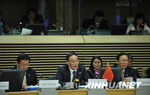 5月7日,在位于比利時首都布魯塞爾的歐盟總部,中國國務(wù)院副總理王岐山(前中)、中國商務(wù)部部長陳德銘(前左)和中國財政部長謝旭人(前右)出席當天開幕的第二次中歐經(jīng)貿(mào)高層對話。新華社記者武巍攝