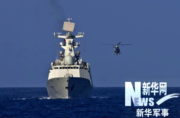 直升機在軍艦周圍警戒。駱源攝