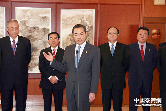 5月25日上午,中共中央臺辦主任王毅在首都機場致辭歡迎中國國民黨主席吳伯雄一行。中國國民黨主席吳伯雄率領(lǐng)中國國民黨大陸訪問團于25日11時許乘機抵達(dá)北京,開始訪問大陸行程。中共中央臺辦主任王毅到機場迎接。(中國臺灣網(wǎng) 鐘寶華 攝)