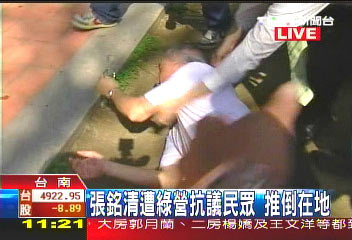 張銘清去年10月21日在參訪臺南孔廟時遭綠營民意代表率人包圍推打跌倒受傷