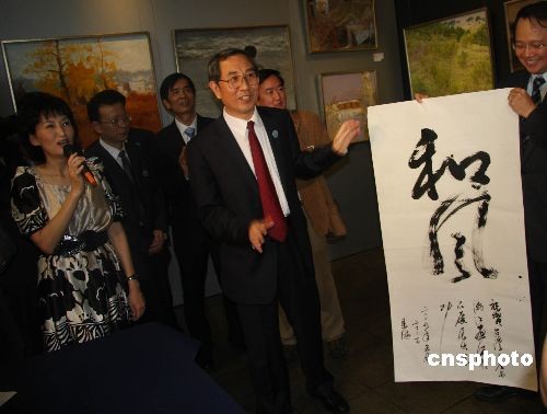 5月23日,廣西壯族自治區(qū)馬飚主席來到臺(tái)北孫中山紀(jì)念館二樓展廳,觀賞“臺(tái)灣——廣西漓江畫派精品展”。藝術(shù)家們盛情邀請(qǐng)酷愛書法的馬飚主席當(dāng)場(chǎng)揮毫。馬飚主席大筆蘸墨、揮毫寫下“和風(fēng)”二字。他說:“桂臺(tái)兩地經(jīng)濟(jì)文化交流合作和睦、和諧如春風(fēng)般平順。我今天只寫‘和風(fēng)’二字。我希望能有機(jī)會(huì)再來臺(tái)灣。再來臺(tái)灣時(shí),我將寫‘萬里’二字! 中新社發(fā) 耿軍 攝