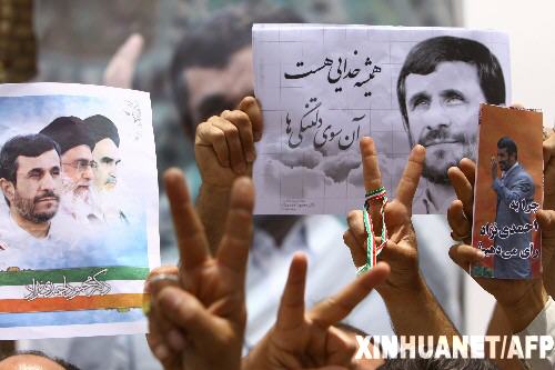 2009年6月13日 支持者慶祝艾哈邁迪-內(nèi)賈德贏得伊朗總統(tǒng)選舉 6月13日,在伊朗宗教圣城庫姆街頭,現(xiàn)任總統(tǒng)艾哈邁迪-內(nèi)賈德的支持者們舉著他的畫像,做出勝利的手勢。根據(jù)伊朗選舉委員會當(dāng)日凌晨公布的數(shù)據(jù),在已統(tǒng)計(jì)的94%的選票中,艾哈邁迪-內(nèi)賈德贏得64.31%的選票,從而贏得伊朗總統(tǒng)選舉。 新華社/法新