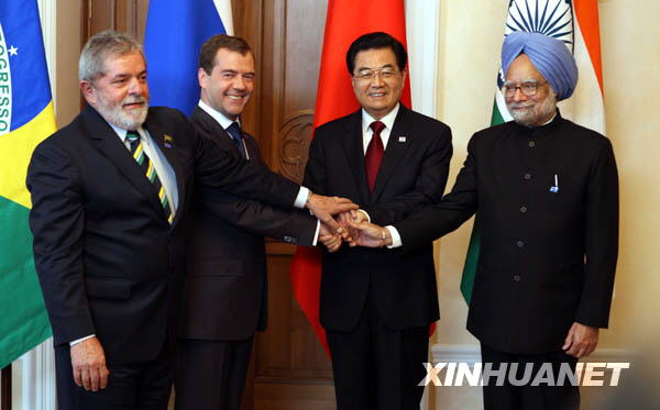 6月16日,中國、巴西、俄羅斯和印度“金磚四國”領導人在俄羅斯葉卡捷琳堡舉行首次正式會晤,中國國家主席胡錦濤出席會晤。這是胡錦濤主席和巴西總統(tǒng)盧拉、俄羅斯總統(tǒng)梅德韋杰夫、印度總理辛格合影。新華社記者姚大偉攝