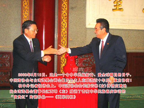2008年6月12日,臺灣海峽交流基金會董事長江丙坤先生一行回中國大陸協(xié)商兩岸關(guān)系改善與發(fā)展,中國海峽會會長陳云林先生贈送的禮品為福建省富貴紅文化發(fā)展有限公司藝術(shù)總監(jiān)徐少東先生創(chuàng)作的富貴紅陶瓷藝術(shù)作品《兩岸同根》。相對于會談議題,似乎只是輕描淡寫的一次禮品互贈,但對于陶瓷業(yè)界來說卻引起了不小的轟動,引發(fā)了人們對陶瓷藝術(shù)品《兩岸同根》的關(guān)注。人們不禁會問:《兩岸同根》何以在這樣的一個高規(guī)格的、意義非同一般的兩岸對話中受到如此高的禮遇?其實,我們將余光中的《鄉(xiāng)愁》與徐少東的《兩岸同根》置放在一起進(jìn)行比較的時候,兩者雖是以不同的語言載體進(jìn)行表現(xiàn)的藝術(shù)作品,但我們?nèi)匀徊浑y發(fā)現(xiàn)其中的緣由。