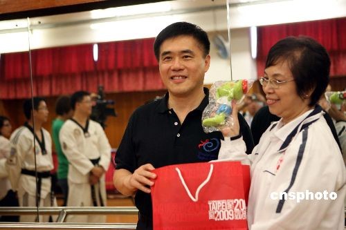 六月二十六日,臺北市市長郝龍斌訪港,到港灣道體育館參觀“09年臺北聽奧運動會”香港代表團選手訓練。郝龍斌向香港跆拳道選手贈送“09年臺北聽奧運動會”吉祥物。 中新社發(fā) 洪少葵 攝