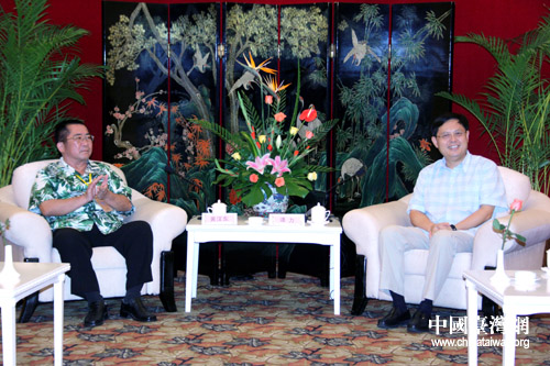 第二屆“兩岸媒體海南行”10日在海口正式啟動,中共海南省委常委、宣傳部長譚力(右)在10日晚間會見了由臺南縣記者協(xié)會理事長賴冠璋率領的臺南媒體一行(中國臺灣網 李徽 攝)