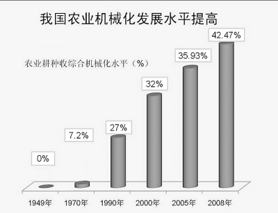 新中國(guó)成立之初,我國(guó)人均占有209公斤原糧,有錢(qián)人多吃一口,很多人就要餓肚子。1949年以來(lái),我國(guó)糧食生產(chǎn)先后登上了3000億斤、6000億斤、8000億斤、10000億斤幾大臺(tái)階。同時(shí),經(jīng)濟(jì)作物生產(chǎn)協(xié)調(diào)發(fā)展。2008年全國(guó)棉花總產(chǎn)量達(dá)到749萬(wàn)噸,比1949年的44萬(wàn)噸增長(zhǎng)了16倍;油料總產(chǎn)2952.8萬(wàn)噸,糖料總產(chǎn)13419.6萬(wàn)噸,分別比1949年增長(zhǎng)了10.5倍和46.3倍。2004—2008年,糧食連續(xù)5年增產(chǎn),2009年實(shí)現(xiàn)夏糧連續(xù)6年增產(chǎn),為經(jīng)濟(jì)社會(huì)平穩(wěn)較快發(fā)展和應(yīng)對(duì)各種困難局面奠定了基礎(chǔ)。