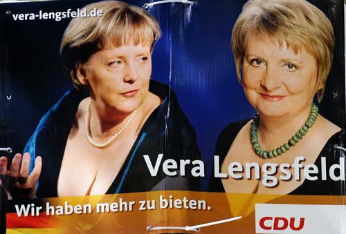 默克爾(左)和倫斯費爾德身穿低胸晚裝,露出乳溝的競選海報,吸引了許多選民的眼球。