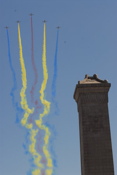 2009年9月21日上午,北京,參加國慶60周年閱兵空中梯隊在天安門廣場上空進行預演。