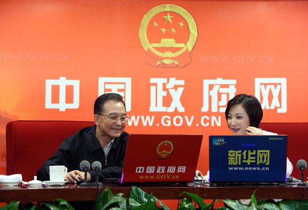 2月28日,中共中央政治局常委、國(guó)務(wù)院總理溫家寶在中國(guó)政府網(wǎng)與網(wǎng)友在線交流。新華社記者 姚大偉 攝