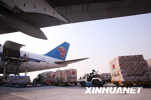 1月16日,救災物資在北京首都國際機場裝機。當日中午,中國政府向海地提供的首批人道主義救災物資從北京首都國際機場啟運。這批物資重約90噸,價值人民幣1300余萬元,包括20余萬份藥品、1000頂帳篷、240套便攜式應急燈、2套水凈化設備、1250公斤食品和飲用水、4080件單衣等當地急需的物品。運載這批物資的波音747包機于北京時間16日中午12時22分起飛,途中計劃經停安克雷奇,飛行時間約19小時。新華社記者 陳建力 攝