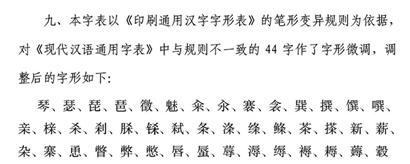 此次公布的44個漢字的調(diào)整包括“琴”字上左部最后一筆橫變提,“衾、汆”等字下部件末筆捺變點,“親、殺”等字下部件的豎鉤變豎,“唇、蜃”等字由半包圍結(jié)構(gòu)改為上下結(jié)構(gòu)等。