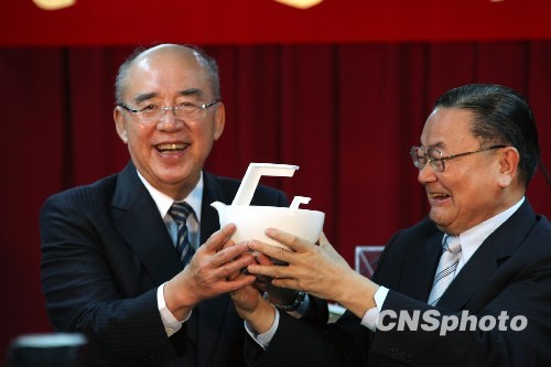 10月14日,中國(guó)國(guó)民黨主席吳伯雄主持任內(nèi)最后一次中常會(huì)后,出席國(guó)民黨中央等舉辦的歡送茶會(huì),接受由國(guó)民黨秘書長(zhǎng)詹春柏代表新主席當(dāng)選人馬英九致贈(zèng)的瓷茶壺“海量”,感謝他的包容與大量。10月17日,國(guó)民黨第18屆全黨代表大會(huì)將在臺(tái)北縣召開,新舊主席將進(jìn)行交接。 中新社發(fā) 黃少華 攝