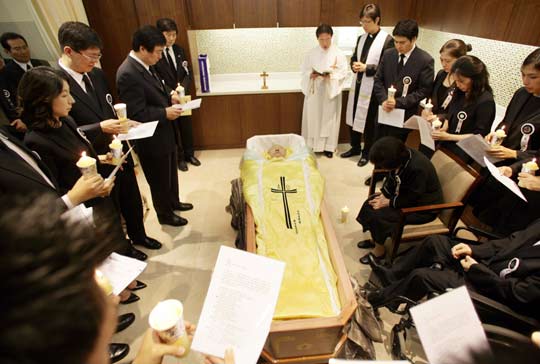 韓國前總統(tǒng)金大中的入殮儀式20日中午在首爾塞弗倫斯醫(yī)院臨時靈堂舉行。