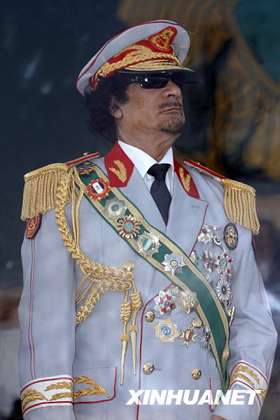 9月1日,在利比亞首都的黎波里,利比亞領導人卡扎菲檢閱利比亞革命40周年閱兵儀式。新華社發(fā)(哈姆宰·圖爾克攝)