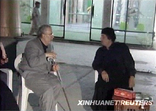 這張8月21日的視頻截圖顯示,利比亞領導人穆阿邁爾卡扎菲(右)在利比亞首都的黎波里與提前獲釋回國的洛克比空難制造者邁格拉希交談。邁格拉希身患晚期前列腺癌,經(jīng)過利比亞官員與蘇格蘭司法部門的協(xié)商,邁格拉希提前結束在蘇格蘭的刑期。美國白宮發(fā)言人吉布斯21日抨擊利比亞方面為提前獲釋回國的洛克比空難制造者邁格拉希舉行歡迎活動。新華社/路透