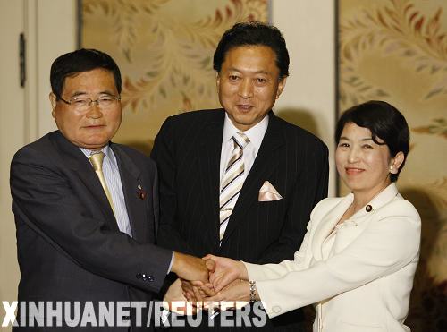 9月9日,日本民主黨代表(即黨首)鳩山由紀(jì)夫(中)、社民黨黨首福島瑞穗(右)和國民新黨代表龜井靜香在日本首都東京握手。當(dāng)天,在日本眾議院大選中獲勝的民主黨與社民黨和國民新黨就三黨聯(lián)合執(zhí)政達(dá)成了協(xié)議。新華社/路透