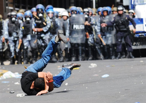 9月23日,在洪都拉斯首都特古西加爾巴,一名抗議者與警察對抗。
