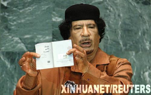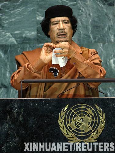 9月23日,利比亞領(lǐng)導(dǎo)人穆阿邁爾·卡扎菲在聯(lián)合國(guó)大會(huì)一般性辯論上發(fā)言時(shí),佯裝要撕毀《聯(lián)合國(guó)憲章》?ㄔ23日在第64屆聯(lián)大一般性辯論中發(fā)言說,必須在國(guó)際政治中實(shí)行民主,對(duì)聯(lián)合國(guó)及安理會(huì)實(shí)行改革,真正實(shí)現(xiàn)各國(guó)在聯(lián)合國(guó)的平等地位。這是卡扎菲執(zhí)政40年來首次來到紐約聯(lián)合國(guó)總部并在聯(lián)大一般性辯論中發(fā)言。新華社/路透