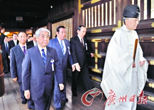 10月20日上午,包括日本眾院副議長衛(wèi)藤征士郎在內(nèi)的54名“超黨派”人士,“效仿”谷垣禎一公然集體參拜靖國神社。
