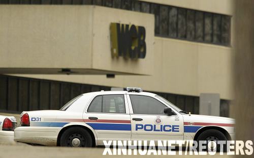 10月21日,一輛警車停在加拿大西部城市埃德蒙頓市工人賠償委員會大樓外。當(dāng)天上午,一名男子手持步槍闖入該市工人賠償委員會大樓,劫持了數(shù)名人質(zhì)。 新華社/路透