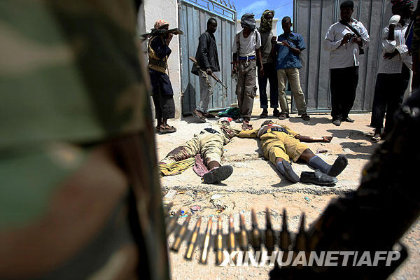 2009年7月13日,在索馬里首都摩加迪沙,反政府武裝聚集在交火中被打死的2名警察周?chē)K黢R里政府軍12日在首都摩加迪沙北部與反政府武裝交火,擊斃40名反政府武裝人員。政府軍死亡3人。新華社/法新