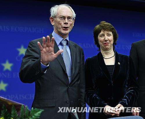 11月19日,在比利時(shí)首都布魯塞爾歐盟總部,比利時(shí)首相赫爾曼·范龍佩(左)和歐盟貿(mào)易委員凱瑟琳·阿什頓在當(dāng)選后出席新聞發(fā)布會(huì)。 新華社/路透