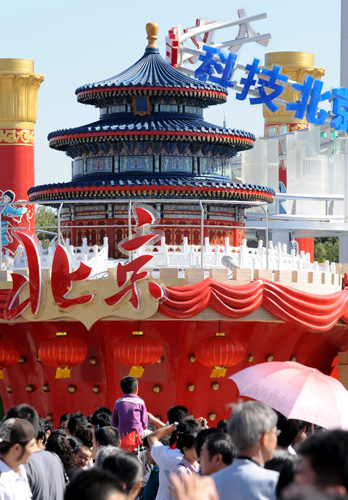 10月2日,游客在“北京之歌”彩車前參觀留影。 據(jù)了解,在10月1日國慶群眾游行中出現(xiàn)的彩車將從2日至7日在天安門廣場進行展示。這些彩車充分展示出新中國成立60年來取得的輝煌成就,表達了56個民族的群眾對偉大祖國的衷心祝福。 新華社記者 唐召明 攝