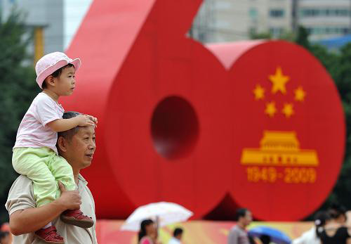 10月1日,一位市民帶著孩子經(jīng)過福州街頭的新中國成立60周年國慶慶;顒訕酥。十一長假期間,各地國慶游園活動中、廣場綠地上隨處可見孩子們的可愛身影。對純真的兒童而言,十一是祖國母親的生日,也是他們的快樂假期。新華社記者 姜克紅攝