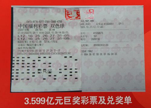2009年10月8日晚,中國福利彩票雙色球第2009118期開獎,當期全國共中出一等獎93注,每注獎金409.07萬元,其中河南省彩民一舉獲得88注一等獎,累計獲得獎金3.599億元,創(chuàng)造了新中國彩票發(fā)行以來單張彩票獲頭獎金額最高的新記錄。