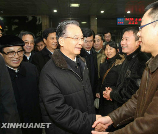 11月12日,中共中央政治局常委、國務(wù)院總理溫家寶趕赴河北暴雪地區(qū)指導(dǎo)工作。圖為抵達(dá)石家莊后,溫家寶前往火車站候車室看望旅客。新華社記者劉衛(wèi)兵攝