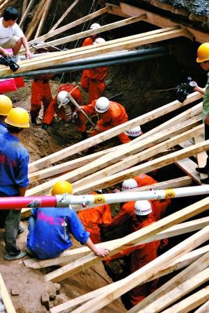 昨日,消防官兵在塌方現(xiàn)場全力施救。昨日上午9時(shí)20分,西安地鐵一號線灑金橋站施工工地發(fā)生塌方,兩名正在作業(yè)的工人被埋。三個(gè)小時(shí)后,兩人被陸續(xù)救出時(shí),已無生命體征,送往醫(yī)院后經(jīng)搶救無效身亡。據(jù)施工方工作人員介紹,可能因?yàn)榻者B續(xù)下雨,土質(zhì)松軟才導(dǎo)致塌方。張望攝 (圖片來源:新京報(bào))