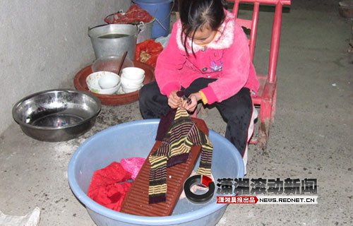 年幼的龔林俊正在洗衣服。
