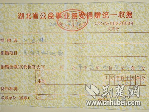 4月25日,從蘭桂冒雨和優(yōu)酷拍客四葉未明來(lái)到湖北省紅十字會(huì),當(dāng)場(chǎng)捐出二個(gè)多星期以來(lái)自己在街頭畫畫別人所給的500元。