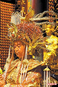 邱嘉進說,媽祖和鳳冠都是請臺北縣三峽鎮(zhèn)的雕刻師傅賴威佑設(shè)計雕刻,共花了兩年半時間,神尊上月底完工迎回廟內(nèi)供奉,昨為神尊戴上鳳冠,對信眾來說“是無價之寶”!