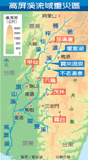高雄縣消防局救災中心昨天下午陸續(xù)接到報案,接近中央山脈末端的啞口與梅山口一帶下起豪大雨,造成梅山口一處堰塞湖宣泄不及而潰堤,山洪爆發(fā)后,荖濃溪洪水急漲,挾帶大量土石流向桃源鄉(xiāng)勤和村沖刷而下。