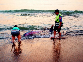 金山派出所昨天清晨5時接獲婦人報(bào)案,指出水尾沙灘有海豚擱淺。警員郭光明趕到現(xiàn)場察看,發(fā)現(xiàn)海豚困在沙灘,腹部擦傷滲血;郭與發(fā)現(xiàn)婦人想一起把海豚推回海里,但太重,而且海豚緊張地從噴氣孔噴氣,兩人擔(dān)心弄傷海豚,不敢再動。