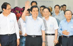 馬英九(中)20日在多位國民黨內(nèi)干部陪同下,完成競選連任國民黨主席登記手續(xù),隨后驅(qū)車到競選總部與基層黨員座談,并向工作人員致意。(圖片來源:臺(tái)灣《中國時(shí)報(bào)》)