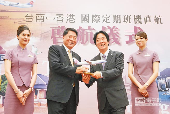 賴清德在儀式上說,兩地開通直航后,一方面要鼓勵臺南市民到港旅游,另一方面也歡迎香港民眾到臺南市。