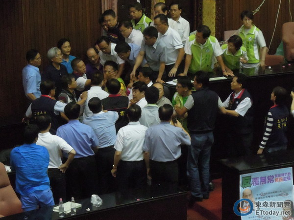 國民黨團書記長賴士葆衣服遭扯破,現(xiàn)場許多“立委”潑水,并有推擠場面。
