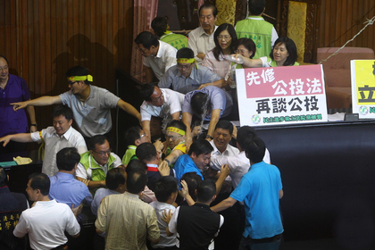 國民黨籍“立委”從2日清晨4時30分左右開始展開搶攻主席臺行動,到中午前,共4波推擠沖突,但在野的民進黨仍固守主席臺。