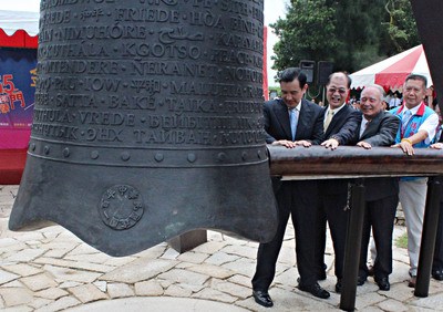 八二三炮戰(zhàn)55周年,23日在金門古寧頭和平紀(jì)念園區(qū)舉辦敲和平鐘祈;顒,馬英九(左起)與縣長李沃士等人敲響和平鐘。臺灣“中央社”