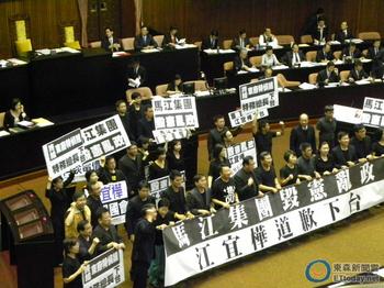 臺“行政院長”江宜樺按原定計劃于17日上午前往“立法院”作施政報告,但因王金平所涉司法關(guān)說案遭在野黨團杯葛破壞。“立法院長”王金平宣布暫時休息,希望藉由朝野協(xié)商解決。(圖片取自臺灣東森新聞網(wǎng))