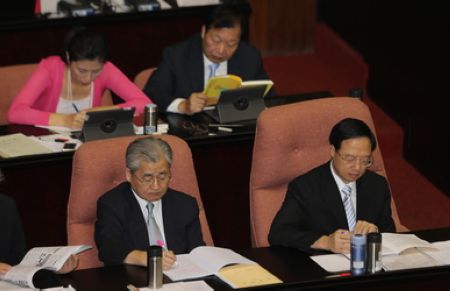 據(jù)臺媒報道,江宜樺比王金平大約晚50分鐘進入議場,在兩個多小時中,兩人目標并無對視,可謂相敬如“冰”。(圖片取自網(wǎng)絡(luò))