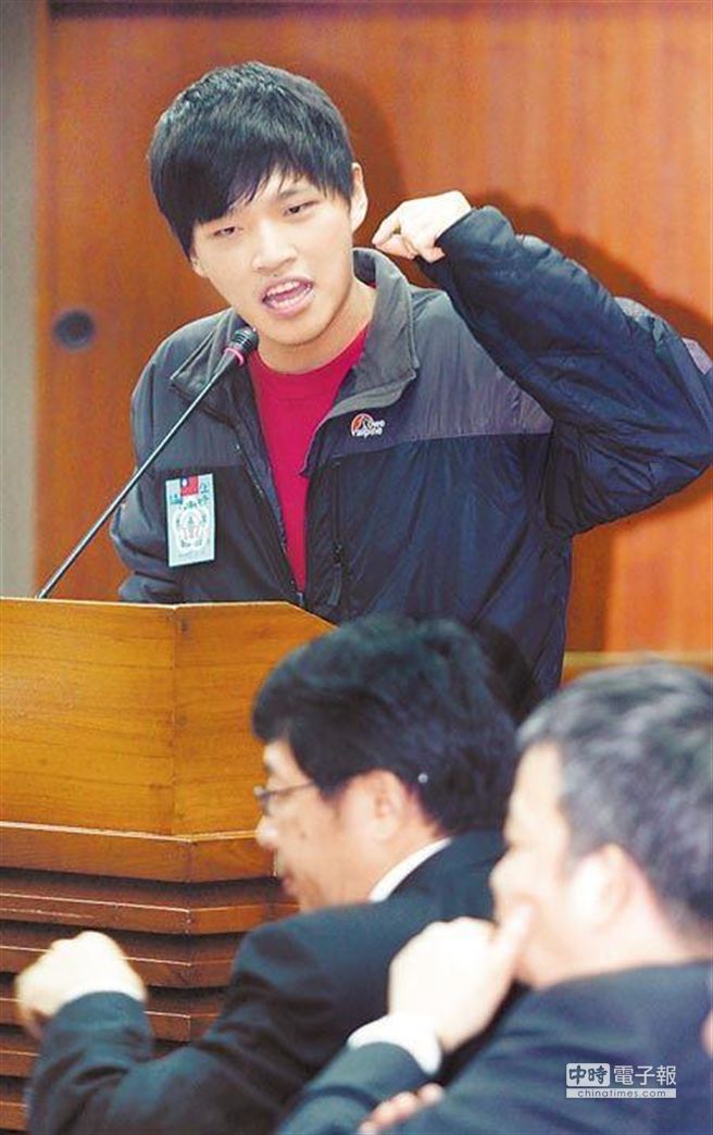 臺灣清華大學(xué)延畢生陳為廷(左)去年12月,在臺灣“立法院”怒批當(dāng)局“教育部長”蔣偉寧(中),引發(fā)正反意見爭論。(圖片來源:臺灣中時電子報)