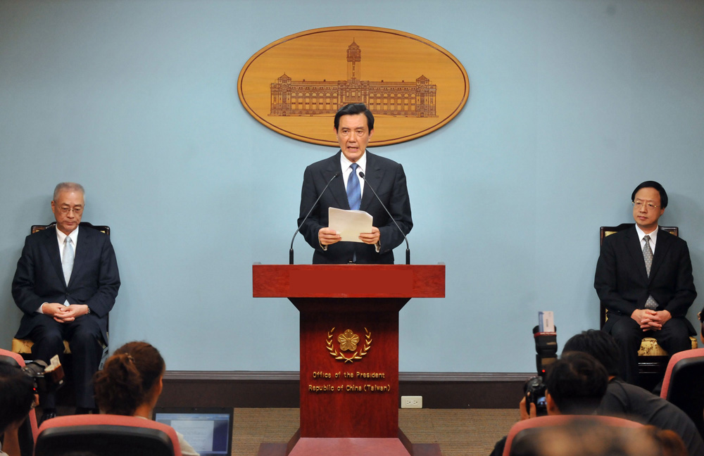 馬英九9月8日在其官邸召開記者會(huì),稱王金平涉入司法關(guān)說案是臺(tái)灣民主法治發(fā)展上“恥辱的一天”,作為臺(tái)灣地區(qū)領(lǐng)導(dǎo)人,他無從回避,必須挺身而出,捍衛(wèi)臺(tái)灣民主法治。左為臺(tái)灣地區(qū)副領(lǐng)導(dǎo)人吳敦義、右為臺(tái)“行政院長(zhǎng)”江宜樺。(圖片取自網(wǎng)絡(luò))